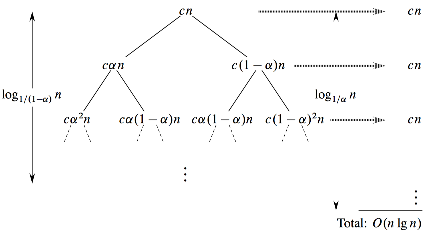 $$T(n) = T(\alpha n) + T((1 - \alpha)n) + cn$$