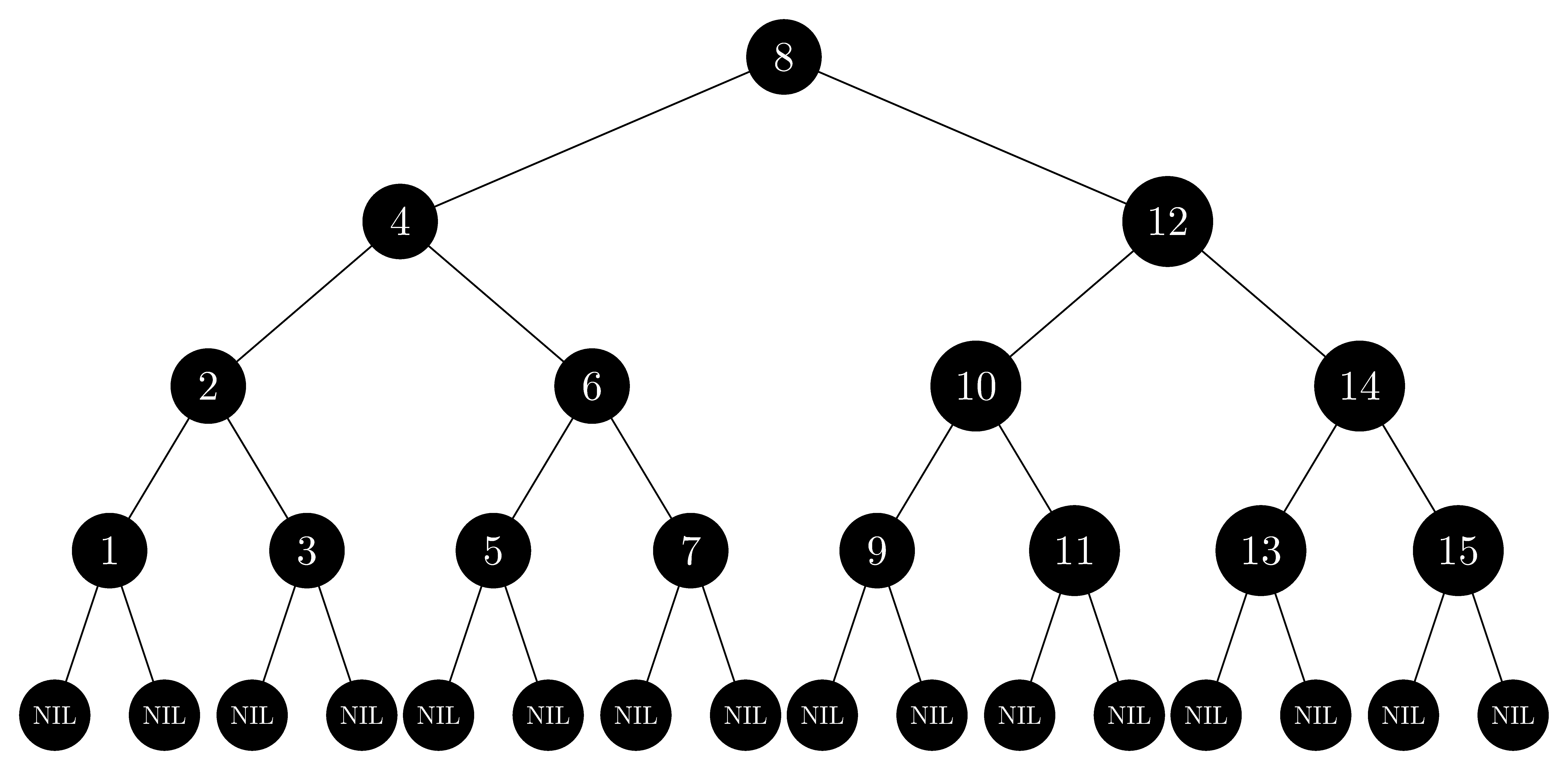 In the style of Figure 13.1(a), draw the complete binary search tree of height $3$ on the keys $\{1, 2, \ldots, 15\}$. Add the $\text{NIL}$ leaves and color the nodes in three different ways such that the black-heights of the resulting red-black trees are $2$, $3$, and $4$.