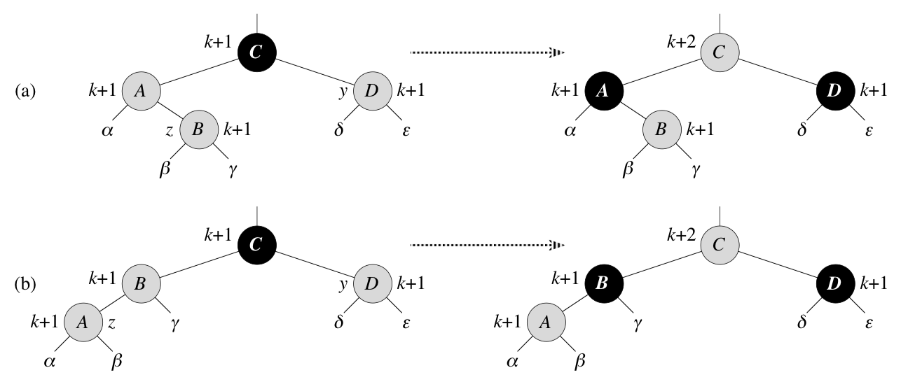 In Figure 13.5, nodes $A$, $B$, and $D$ have black-height $k + 1$ in all cases, because each of their subtrees has black-height $k$ and a black root. Node $C$ has black-height $k + 1$ on the left (because its red children have black-height $k + 1$) and black-height $k + 2$ on the right (because its black children have black-height $k + 1$).