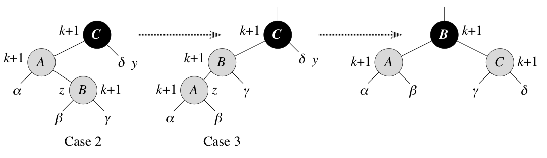 In Figure 13.6, nodes $A$, $B$, and $C$ have black-height $k + 1$ in all cases. At left and in the middle, each of $A$'s and $B$'s subtrees has black-height $k$ and a black root, while $C$ has one such subtree and a red child with black-height $k + 1$. At the right, each of $A$'s and $C$'s subtrees has black-height $k$ and a black root, while $B$'s red children each have black-height $k + 1$.