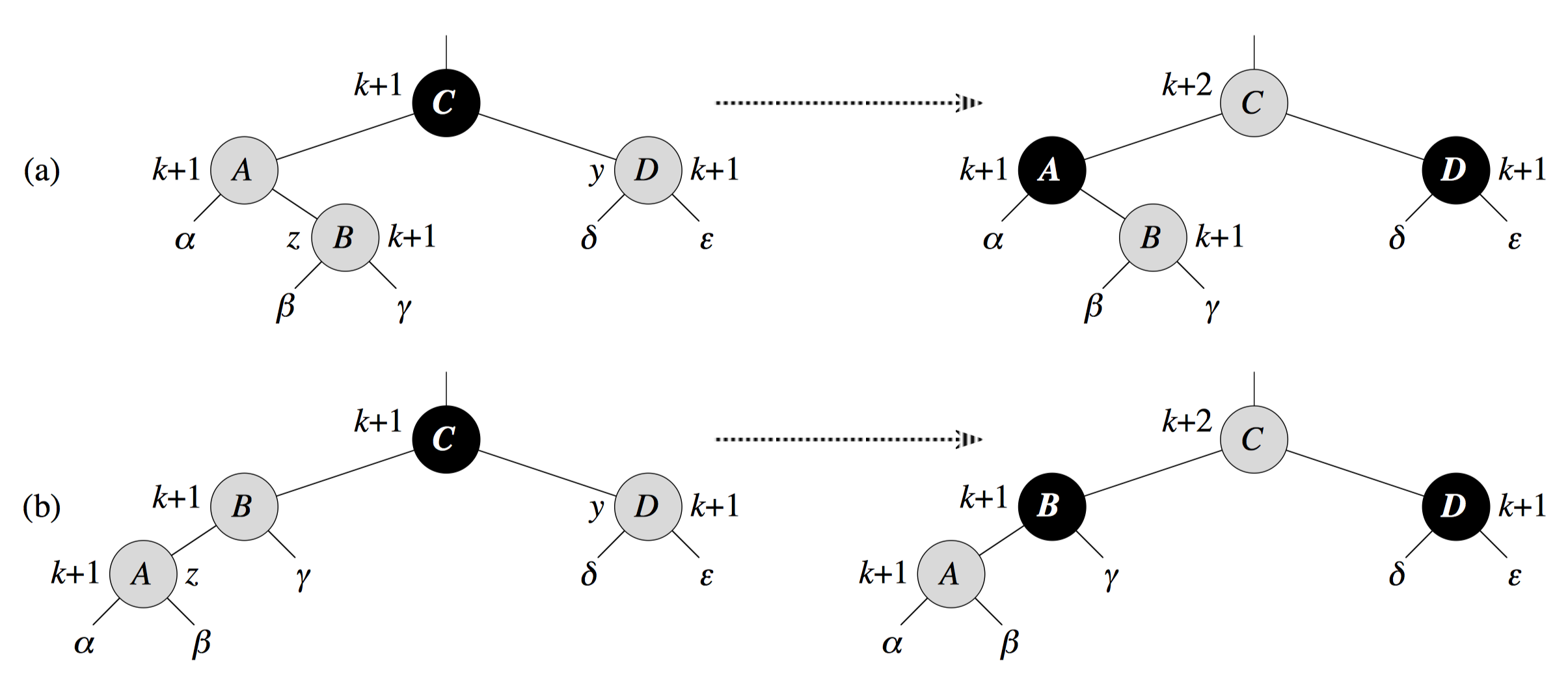 - Before color changes, suppose that all subtrees $\alpha$, $\beta$, $\gamma$, $\delta$, $\epsilon$ have the same black-height $k$ with a black root, so that nodes $A$, $B$, $C$, and $D$ have blackheights of $k + 1$.