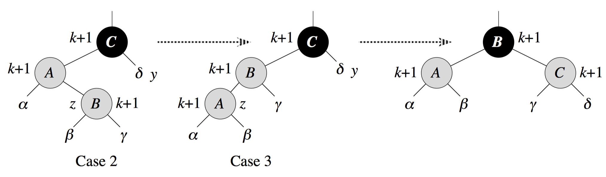 - With subtrees $\alpha$, $\beta$, $\gamma$, $\delta$, $\epsilon$ of black-height $k$, we see that even with color changes and rotations, the black-heights of nodes $A$, $B$, and $C$ remain the same $(k + 1)$.
