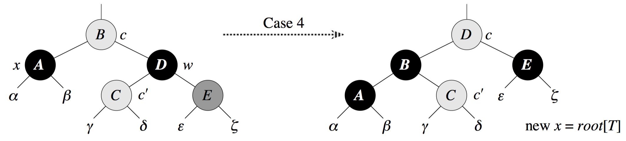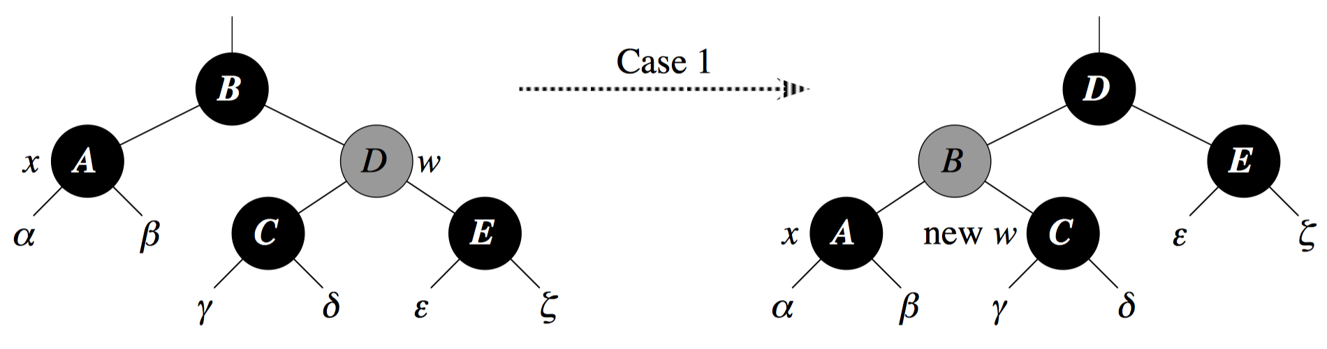 - Case 1 changes the structure of the tree, but waits for cases 2, 3, and 4 to deal with the "extra black" on $x$.