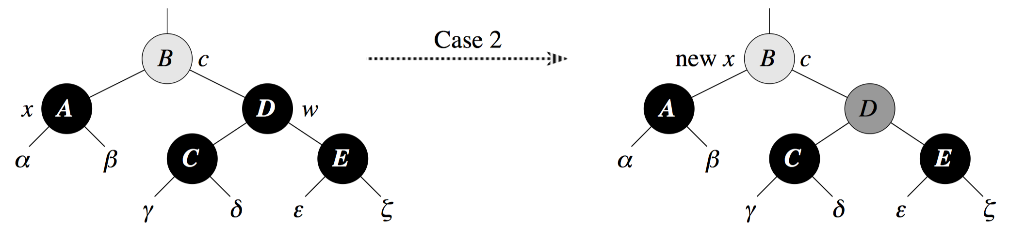 Case 2: $x$'s sibling $w$ is black, and both of $w$'s children are black.