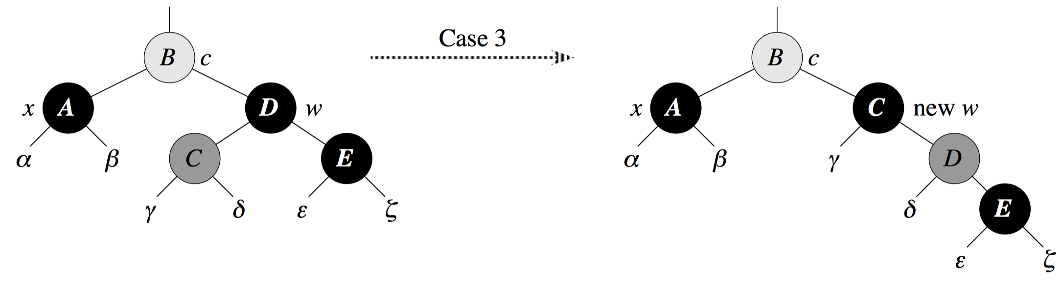 Case 3: $x$'s sibling w is black, $w$'s left child is red, and $w$'s right child is black.