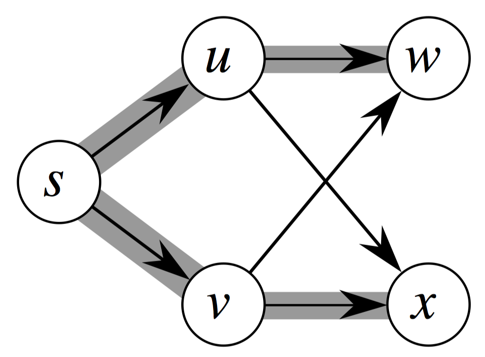 $$ \begin{array}{c|cccccc} \text{vertex} & r & s & t & u & v & w & x & y \\ \hline d & 4 & 3 & 1 & 0 & 5 & 2 & 1 & 1 \\ \pi & s & w & u & \text{NIL} & r & t & u & u \end{array} $$